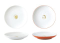 縁起のいい「おかめ」と「ひょっとこ」の模様が入った、紅白ペア小皿。長崎の波佐見町、波佐見焼の磁器です。