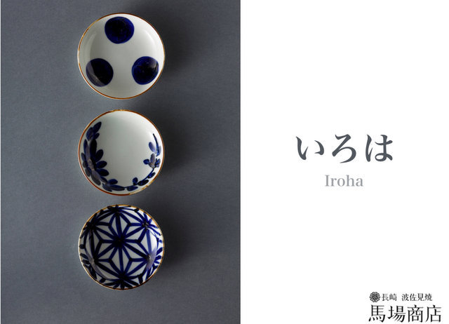 くらわんか碗が流行した宝暦(1750年〜1780年)によく使われた文様3種類「丸文」「麻の葉文」「菊文」を使った「いろは」シリーズの小皿と中皿。手書きで描かれる文様には親しみある風合いが。くらわんか碗がその時代流行した理由を感じられる「いろは」シリーズです。
