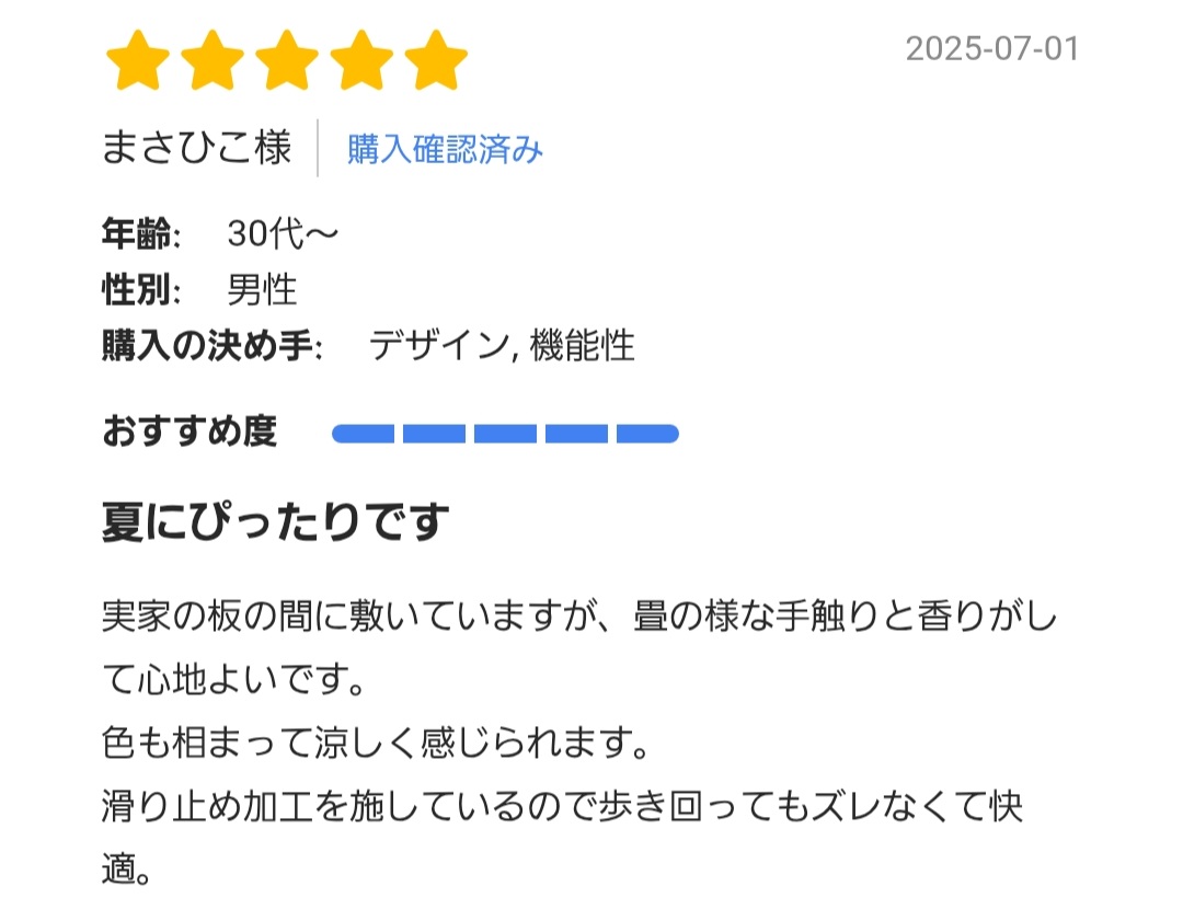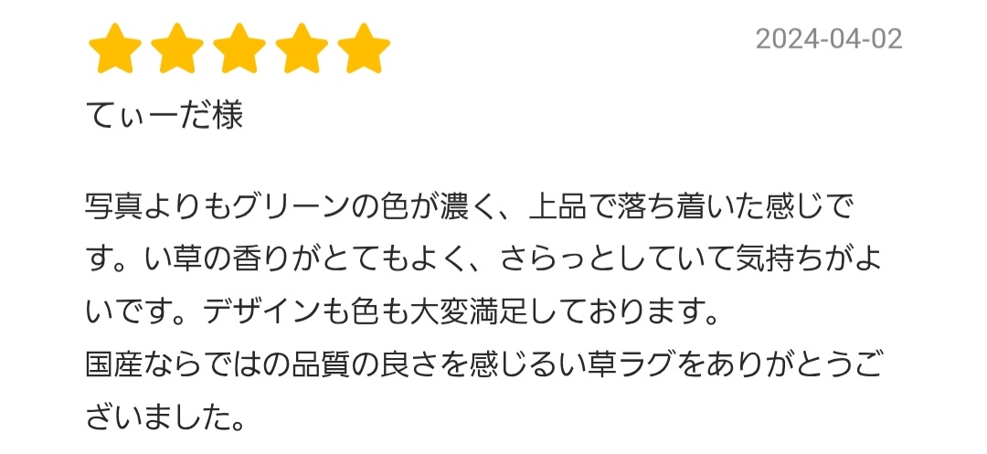 1.天然素材「い草」の魅力5つ夏の暑さや湿気が気になる日本の暮らしを、快適に過ごしやすくしてくれる天然素材。 それが「い草」です。 ここでは、い草の5つの魅力をご紹介します。 【1】サラサラと快適な肌ざわり|吸湿放湿に優れた天然のエアコン ![]() い草は、中がストローのような空洞構造になっているので、湿気を吸ったり吐き出したりする「調湿機能」に優れています。 綿の約2倍の吸湿性・放湿性を持っており、汗ばむ季節もさらりとした肌ざわりをキープ。 ごろんと寝転がったときや素足で歩くときなど、触れるたびに気持ちよく、体感温度を下げてくれる効果もあります。 参考:農林水産省「いぐさ・畳表」 【2】香りでリラックス|天然のフィトンチッドで森林浴気分 ![]() い草には、森林浴のリフレッシュ効果をもたらすといわれる「フィトンチッド」と同様の成分が含まれています。 い草の香りには、自律神経を整えたりストレスを和らげたりするなど、心に安らぎをもたらす癒し効果があるんですよ。 「なんとなく畳の部屋は落ち着く」という感覚は、科学的にも裏付けされているのです。 お部屋にいながら、自然の中で深呼吸しているような感覚を得られるのも、い草ラグの魅力です。 参考:農林水産省「いぐさ・畳表」 【3】集中力アップにも◎|香り・触感・色の3拍子 ![]() い草の意外な効果として注目されているのが、「集中力を高める力」。 い草の香りや落ち着いた色味、さらりとした感触は、適度に緊張を和らげ、集中を持続させる環境づくりに一役買ってくれます。 リモートワークや勉強する環境にもおすすめです。 参考:農林水産省「いぐさ・畳表」 【4】有害物質をキャッチ|空気を整えるい草の力 ![]() い草は「天然の空気清浄機」とも呼ばれるほど、空気中の有害物質を吸着する力にも優れています。 その秘密は、内部にあるスポンジ状の小さな孔。ホルムアルデヒドや二酸化窒素など、シックハウスの原因となる物質を吸着し、空気をクリーンに保ってくれるのです。 子どもや高齢者、ペットのいる家庭でも安心してお使いいただけます。 参考:広島県立東部工業技術センター「いぐさのホルムアルデヒド吸着率」 【5】地球にもやさしいサステナブル素材|心と暮らしを整える選択 ![]() い草は、使い終わったあとで自然に分解され土にかえる、地球にもやさしい循環型の素材です。 今回ご紹介しているい草ラグの原料、熊本県八代市で育てられている「国産い草」は農薬使用量も少なく、環境負荷の少ない素材として再評価されています。 参考:熊本県い草・畳表活性化連絡協議会「天然いぐさの魅力を もっと手軽に もっと身近に。」 2. 職人が作り上げる「国産い草ラグ」のこだわり3つ今回、ご紹介している「IN STYLE」のい草ラグが多くのお客さまに選ばれているのには、3つの理由があります。以下、くわしくご紹介します。 1:国産い草 × 自社直結の一貫製造体制 ![]() 熊本・八代産の国産い草を100%使用し、その栽培から織り、仕上げまで、IN STYLEが責任を持って管理。 素材の目利きから最終工程に至るまで、一貫して携わっています。 農家さんとも直接やりとりを重ね、生育や収穫のタイミング、品質チェックに至るまで丁寧に対応。選び抜かれた上質ない草だけを使って商品に。 すべての工程に想いと責任が込められているからこそ、安心して長く使い続けられるのです。 2:伝統技術 × 熟練職人の“手仕事”が生む上質な仕上がり ![]() IN STYLEのい草ラグは、福岡県発祥の伝統技法「掛川織」をはじめ、模様表現が得意な「紋織」や、やわらかな風合いが魅力の「袋織」など、用途やデザインに応じた織り方が使い分けられています。 なかでも掛川織は、い草ラグの中でも最高級とされる織り方。 たて糸の本数をあえて少なくしていることで、よこ糸にあたるい草の「質そのもの」がラグの仕上がりに大きく影響するのです。 そのため、使用するのはコシが強く、長さと弾力に優れた国産い草だけ。一般的ない草製品と比べて、約30〜50%も多くのい草を贅沢に使っています。 織りの工程では、熟練の職人が一本一本丁寧に織り上げていくことで、見た目の美しさはもちろん、しっかりとした厚みと型崩れしにくい丈夫さも兼ね備えています。 織り上がった後は、人の目と手による丁寧な検品を実施。 ![]() 折れや割れなどの不具合がないかを一点ずつ確認し、品質に妥協のない製品に仕上げています。 こうして完成したラグは、伝統技術と職人の技が息づく一枚。 使うほどに味わいが深まり、長く愛用できる品質をお届けしています。 3:快適に使っていただけるように。裏貼り加工やサイズオーダーにも対応 ![]() 「い草のラグが、すぐにズレてイライラ」 「子どもや高齢者がすべりそうでこわい」 そんなプチストレスや不安を解消するために、裏貼り加工ならスッキリ解消できます。裏貼り加工やサイズオーダーに対応しています。 裏貼りをすれば直接フローリングの床に敷いてもズレ
