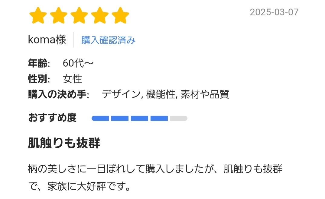 「実際どうなの?」購入者のリアルな声を紹介ガーゼパジャマの贈り物が本当に相手に喜んでもらえるのかどうか、気になりますよね。 実際、この京和晒綿紗ガーゼパジャマシリーズには、2025年5月現在で90件近くの感想が寄せられており、多くの方がその肌ざわりや贈り物としての満足感を実感されています。 ここでは、その中の一部をご紹介します。 ■ガーゼパジャマ購入者の声 ![]() ![]() ![]() ![]() ![]() ![]() ![]() ■ガーゼパジャマ購入者の感想記事 この商品を購入し、実際に使用した感想を外部記事でも紹介しています。