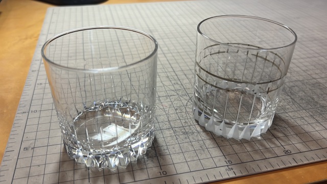 カットした部分を磨くと、曇りが取れて美しく輝くように(左のグラスが磨いた後)。